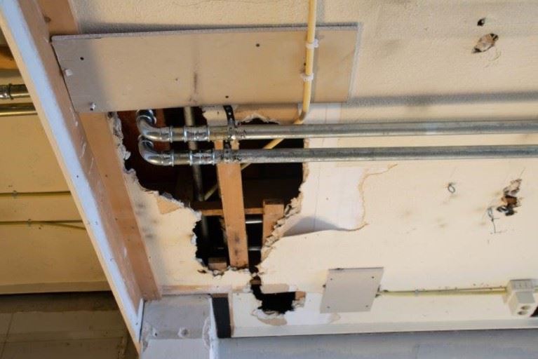 Er zijn nieuwe geschakelde stopcontacten (wandcontactdozen) op het plafond gemonteerd. Dit ten behoeve van de nieuwe verlichting. In het pand zal hieronder een systeemplafond worden aangebracht.